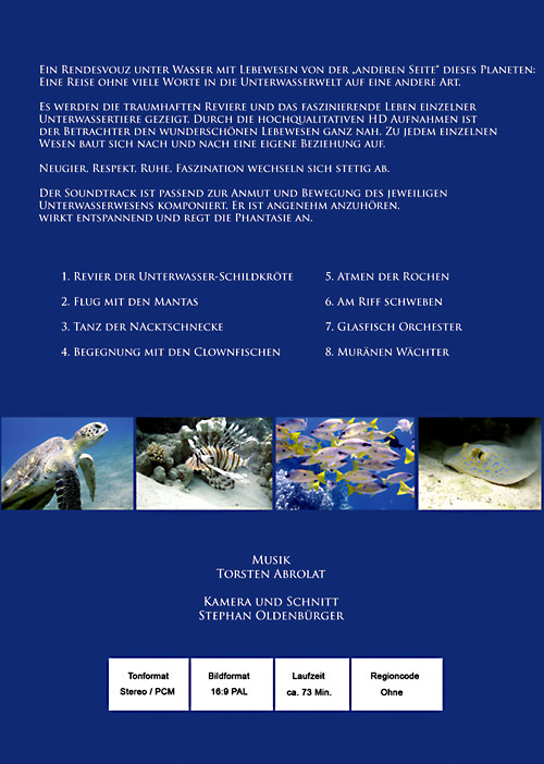 Rendezvous unter WasserDVD Entspannen in einer anderen Welt - im Meer deiner TräumeEin Rendezvous unter Wasser mit Lebewesen von der "anderen Seite" dieses Planetens Reviere: Indischer Ozean: - Nord Ari Atoll Rotes Meer: - Ras Mohammed - Sharm el Sheikh - Marsa Alam - El Quesier - St. Johns Riff Es werden die traumhaften Reviere und das faszinierende Leben einzelner Unterwasser Tiere gezeigt. Durch die hochqualitative HD Aufnahmen ist der Betrachter den wunderschönen Lebewesen ganz nah. Zu jedem einzelnen Wesen baut sich nach und nach eine eigene Beziehung auf. Neugier, Respekt, Ruhe, Faszination wechseln sich stetig ab. Erscheinungsdatum: 21.10.2013